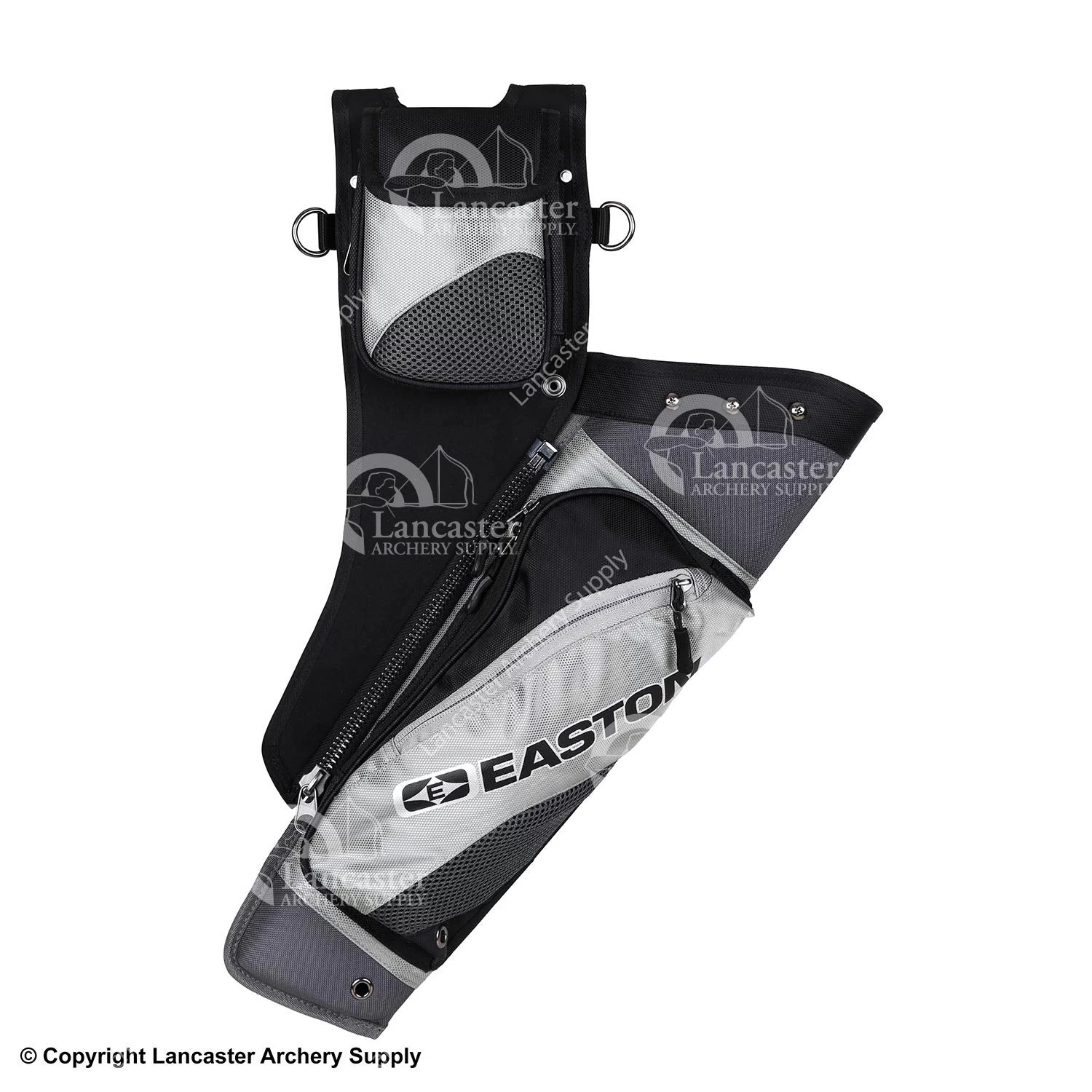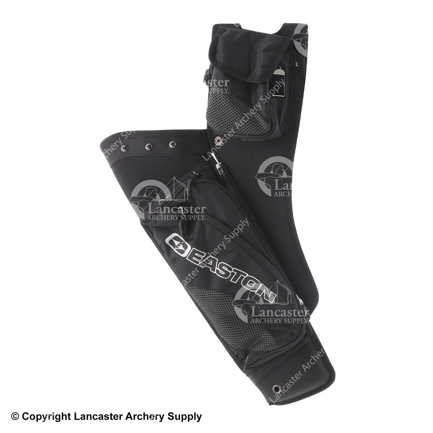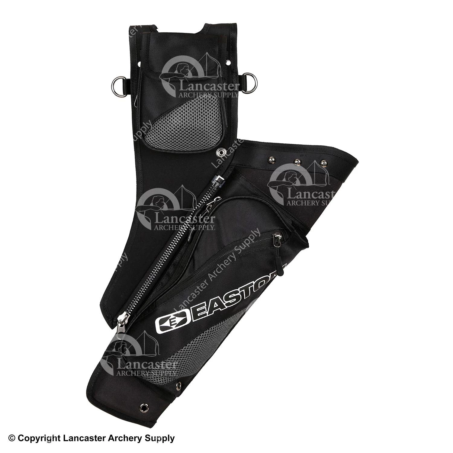 Removable arrow dividers allow the archer to customize arrow storage in this quiver, which pitches the arrows in front of the archer. Lots of pockets and compartments for gear storage. A good choice for recurve or compound archers.